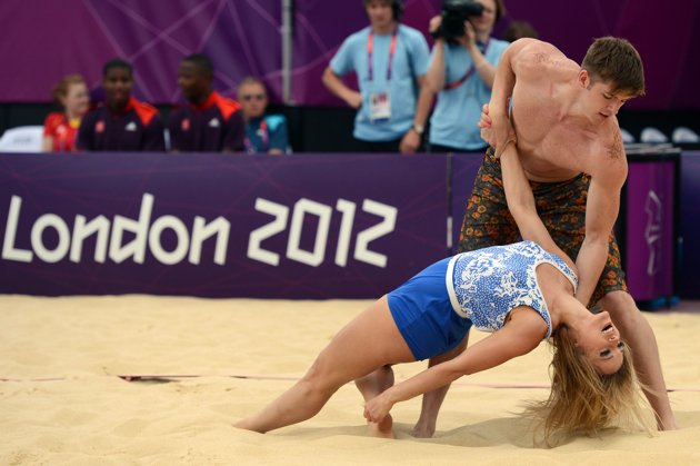 Olympic cheerleaders are entertaining crowds at the basketball, beach volleyball, and indoor volleyball venues. The London organizing committee hired the English 'Crimson Heat ' cheer squad as the official cheerleaders of the 2012 Games. Hearkening back to the days of an amateur Games, the squad is not being paid for their services.